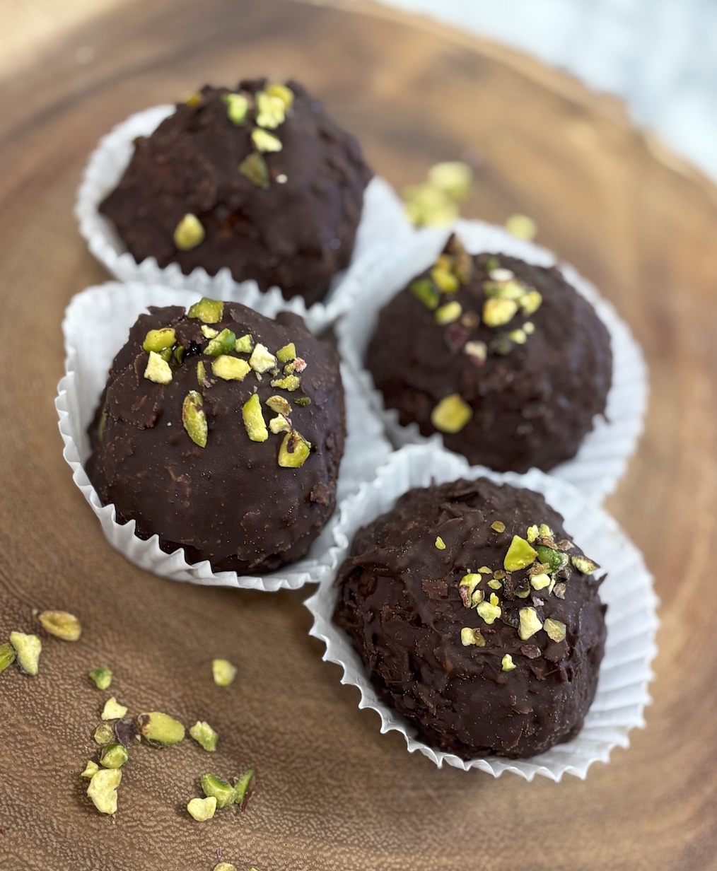 Moist pistachio cake rolled into bite-sized treats, layered with delicate wafer crunch and finished in smooth semi-sweet chocolate.