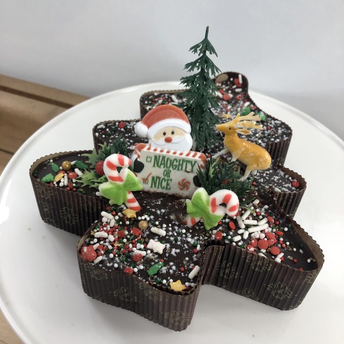 Vanilla cake with chocolate chip, topped with ganache and Christmas themed edible and non edible decor. Approximately 5″ X 3″ in size.